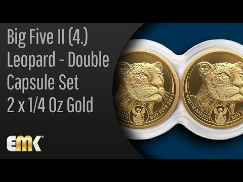 Diese 2023er Ausgabe ist dem Leopard gewidmet und als Doppel-Kapsel in der Qualität Polierte Platte erschienen. Der einzigartige Satz enthält zweimal die vierte Ausgabe der neuen Big Five II. Serie - geprägt aus je einer 1/4 Unze 99,99% reinem Gold. Das Motiv beider Goldmünzen zeigt den Kopf eines ausgewachsenen Leoparden. Die Aufschriften "SOUTH AFRICA", "BIG FIVE 2023" und das südafrikanische Wappen sind ebenfalls Bestandteil des Designs. Die Rückseite zeigt zwei Hälften eines Leopardenkopfes. Platziert man zwei dieser Münzen nebeneinander, erhält man ein vollständiges Nahaufnahmeporträt eines Leoparden. Wenn mehrere dieser Münzen nebeneinander gelegt werden, ist ein ganzes Leopardenrudel zu sehen.