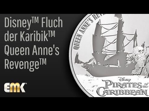 Geprägt von der New Zealand Mint aus einer Unze 99,9% Silber, zeigt das Motiv der Premium-Anlagemünze ein schemenhaftes Abbild des Schiffes sowie eine stilisierte Darstellung seines Kapitäns Edward Teach - besser bekannt als Blackbeard - der einen Totenkopf in der Hand hält. Die Aufschriften "QUEEN ANNE'S REVENGE", "PIRATES OF THE CARIBBEAN", "1 oz 999 Fine Silver" und das Disney™-Logo und Copyright sind ebenfalls im Design enthalten. Die Rückseite zeigt das Porträt von Königin Elizabeth II sowie die Inschriften "TWO DOLLARS", "ELIZABETH II", "2022" und "NIUE".