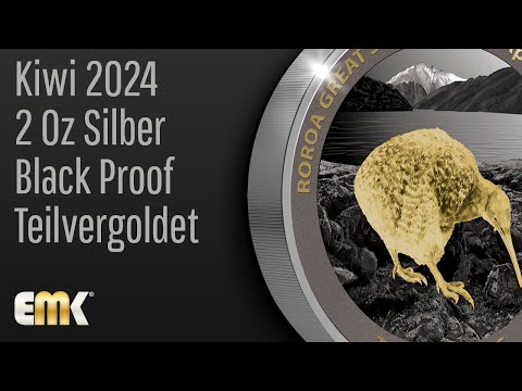 Die 2024er Kiwi Münze wurde von der New Zealand Post aus 2 Unzen 99,9% Silber in Black Proof und High Relief geprägt. Das von Stevan Stojanovic entworfene Motiv ist teilvergoldet und zeigt die Darstellung eines Großen Fleckenkiwis (Apteryx maxima) am Ufer des Rotoiti-Sees im Nelson Lakes National Park. Das Design enthält außerdem die Inschrift "ROROA GREAT SPOTTED KIWI Apteryx maxima" und den Nennwert. Auf der Rückseite sind das teilvergoldete Porträt von König Charles III sowie die Aufschriften "NEW ZEALAND", ".999 Ag 2oz", "CHARLES III" und "2024" abgebildet.