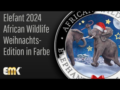 The Christmas Edition Somalia Elephant 2024 from the popular African Wildlife Series was struck from one ounce of 99.99% pure silver and is placed in a Christmas snow globe. The African Wildlife Series is characterized by an annually changing motive and is very popular worldwide. The motive shows two male elephants fighting with each other. A snowy African steppe, a variety of golden stars and a few candy canes are depicted in the background. The edge features the inscriptions "AFRICAN WILDLIFE" and "ELEPHANT" as well as the weight "1 oz" and the fineness "Ag 999.9". The reverse shows the Somali national coat of arms as well as the inscription "SOMALI REPUBLIC 2024 100 SHILLINGS". The capsuled Christmas coin is the ideal gift idea !