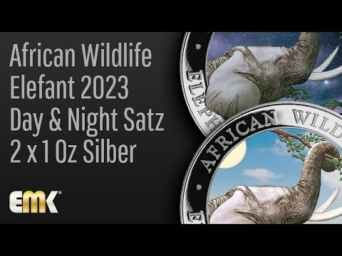 This Somalia Elephant 'Day & Night' set features the 2023 Elephant design of the popular African Wildlife Series in color - one by day and one by night. Both coins were struck from one ounce of 99.99% pure silver in uncirculated quality. The African Wildlife Series is characterized by an annually changing motive and is very popular among collectors and investors worldwide. The motives of both coins show the head of a fully grown elephant as he wraps his trunk around a hanging branch. The African steppe landscape is outlined in the background. At the edge of the coin are the inscriptions "AFRICAN WILDLIFE" and "ELEPHANT", "1 oz" and the fineness "Ag 999.9". The reverse features the Somalian state coat of arms, which depicts a shield with a star, which is supported by two leopards. Below this symbol are two traditional spears and two Palm leaves and the inscription - "SOMALI REPUBLIC 2023 100 SHILLINGS". The limited Day & Night Elephant set is delivered in the original box including a certificate of authenticity.